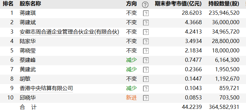 数据显示,目前香飘飘的实控人为蒋建琪、陆家华夫妇,蒋建琪的兄弟蒋建斌、女儿蒋晓莹、陆家华控制的安徽志同道合企业管理合伙企业均持有香飘飘的股份,蒋建琪家族占据香飘飘前十大股东中的前五席,合计持股86.10%。