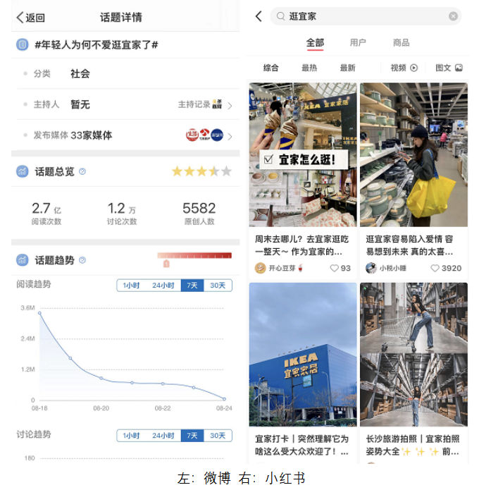 例如逛宜家这件事,微博热搜明确提出年轻人已经与这项活动渐行渐远,可当我们在小红书、抖音等年轻人聚集地搜索相关内容,得到的却完全是另一种画风。年轻人不仅爱逛,还爱分享,逛吃攻略持续更新。