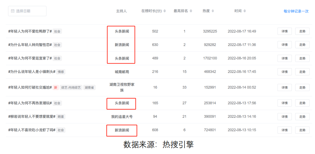 根据“热搜引擎”提供的数据,2019年10月26日至2022年8月24日,以“年轻人”为关键词的微博热搜话题共有516条。
