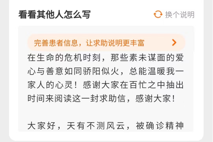 求助说明部分完全可以套用水滴筹提供的“模板”,而医疗证明部分,有部分“志愿者”会带着患者纠缠医生,开病情较为严重的证明,以便于提升筹款金额。至于经济状况,也基本由筹款人自行“决定”。