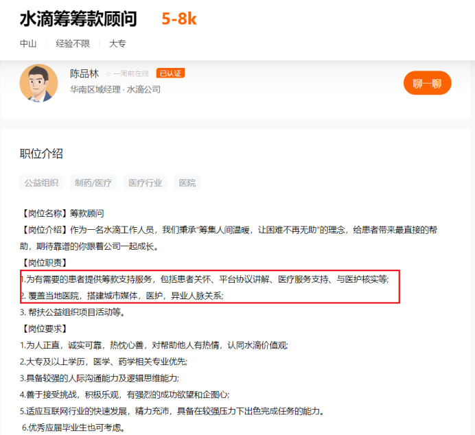 无论是从财报阐述,还是实际招聘信息,都足以证明水滴授权第三方途径的事实。而在这些所谓的第三方里,便包含了不少的“职业筹款推广人”。