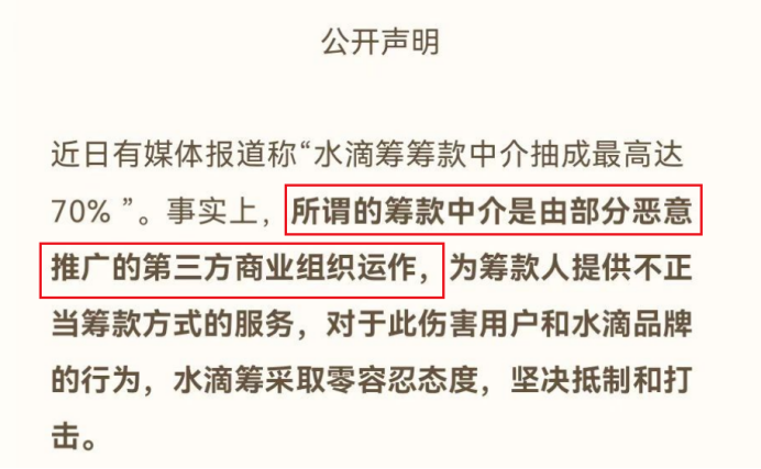近日,互联网众筹平台“水滴筹”再登热搜。有媒体曝出水滴筹大病筹款链接存在灰色链条,背后筹款中介抽成最高达70%,消息一出,水滴筹紧急发布了声明。