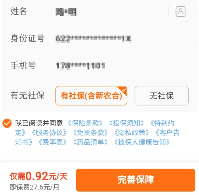 点击投保之后,在“我已阅读并同意”部分,包含了保险条款、健康告知等一大堆相关信息。
