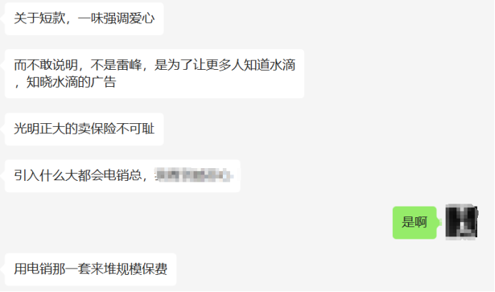 一位前水滴保工作人员钱先生告诉锌财经:“现在水滴发展的不怎么好,原因就是一味地为了销售、为了转化率,嘴上一直说什么爱与责任,就是不敢光明正大地讲自己在卖保险。在我看来,把该做的义务做好,光明正大地卖保险并不可耻。”