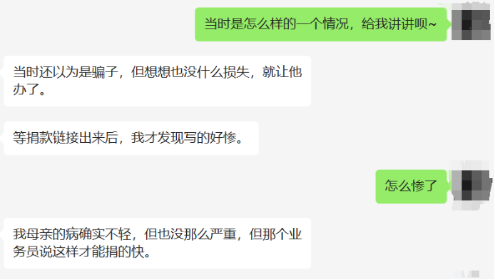 李先生向锌财经表示:“当时还以为是骗子,但想想也没什么损失,就让他办了。等捐款链接出来后,我才发现写的好惨。我母亲的病确实不轻,但也没那么严重,但那个业务员说这样才能捐的快。”