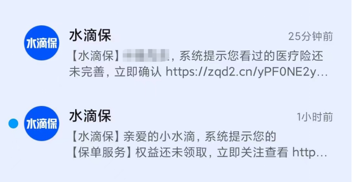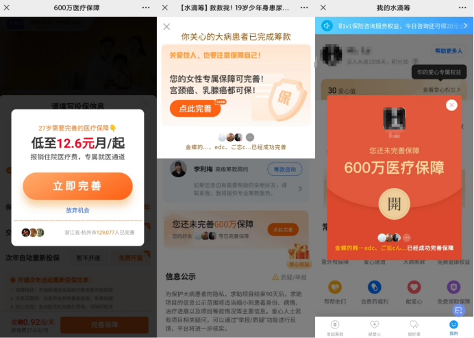 事实上,水滴的做法此前更甚。诸如“恭喜您被选中爱心健康互助金体验用户”、“点击领取专属特权”、“1元领取30万抗癌互助金”、“600万医疗保障金首月3元 次月11.5元”......这些以超低价门槛误导用户的广告层出不穷,直到监管出台相关政策之后,才有所改善。
