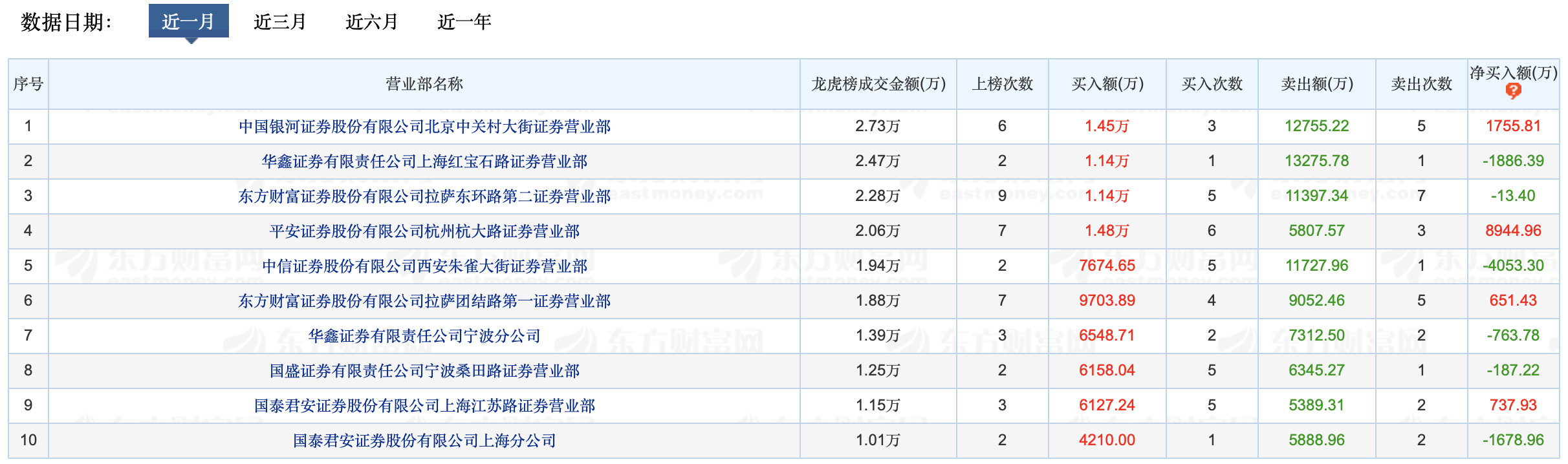 盘后龙虎榜显示,拉萨天团三大席位同时上阵,占据买一、买三、买四席位,共计买入5861.59万股,买二为东方财富证券山南香曲东路证券营业部。卖出席位上,平安证券杭州杭大路营业部位居榜首,卖出3368.15万股。