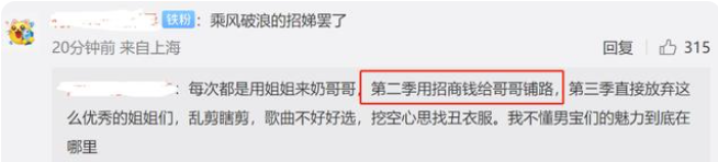 随着《披荆斩棘》的播出,当网友看到阵容、舞美、剪辑比《乘风破浪》更为用心,认为进一步坐实了“招娣之说”,表示:“笑死掉,乘风破浪才结束不久立马开播披荆斩棘,像极了刚把女儿嫁出去收到彩礼,立马给儿子娶媳妇的爹妈”,还有网友开始抵制《披荆斩棘》,表示“因为乘风破浪的招娣,拒看顺风顺水的哥哥 ”……
