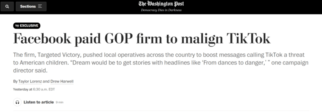 更离谱的是,今年3月《华盛顿邮报》披露,Facebook曾雇佣美国共和党最大的战略咨询公司“目标胜利”,连续数月对TikTok发起舆论攻击,将源于Facebook上的不良挑战,如“打老师挑战”、“学生偷窃公物挑战”等,转嫁给TikTok,以此加大对TikTok的道德杀伤力。