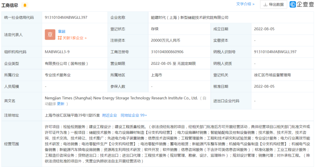 8月5日,宁德时代与电力规划总院等共同出资建立了能建时代(上海)新型储能技术研究院有限公司,其主营业务包括蓄电池租赁、电池销售、新能源汽车整车销售、软件开发、储能技术服务等等。