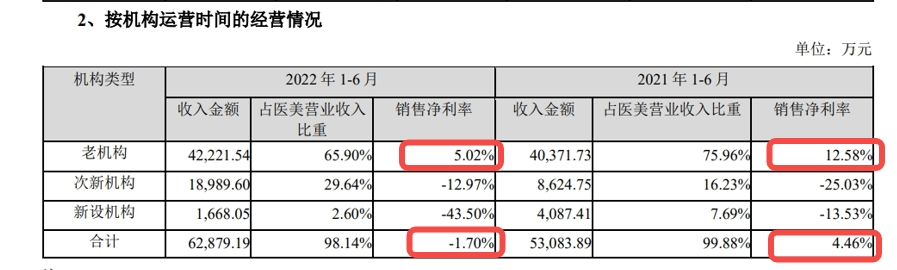 数据显示,2022年上半年,朗姿股份旗下老医美机构(指运营三年以上机构)销售净利率从去年同期的12.58%,下降至5.02%,而这部分老机构贡献了医美板块近7成的收入。