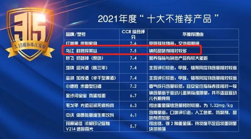 今年央视“315晚会”,揭开了土坑酸菜的黑幕,而就在同一天,珠江经济台联合《消费者报道》杂志也发布了一份“2021年度十大不推荐产品”名单,其中涪陵榨菜旗下的主产品乌江榨菜因钠含量过高名列其中。