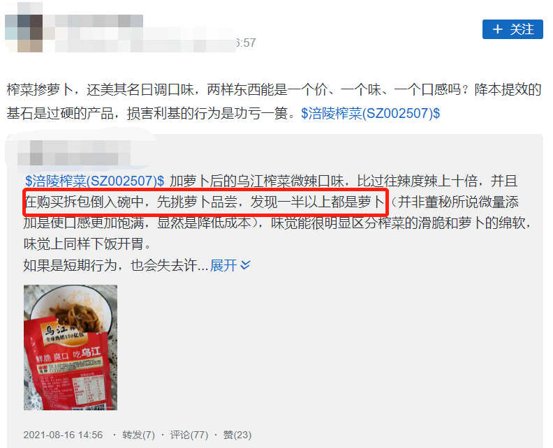 当时,涪陵榨菜的回复是,微量添加萝卜,并非对冲成本,而是对市场进行调研测试,让消费者口感体验更饱满。