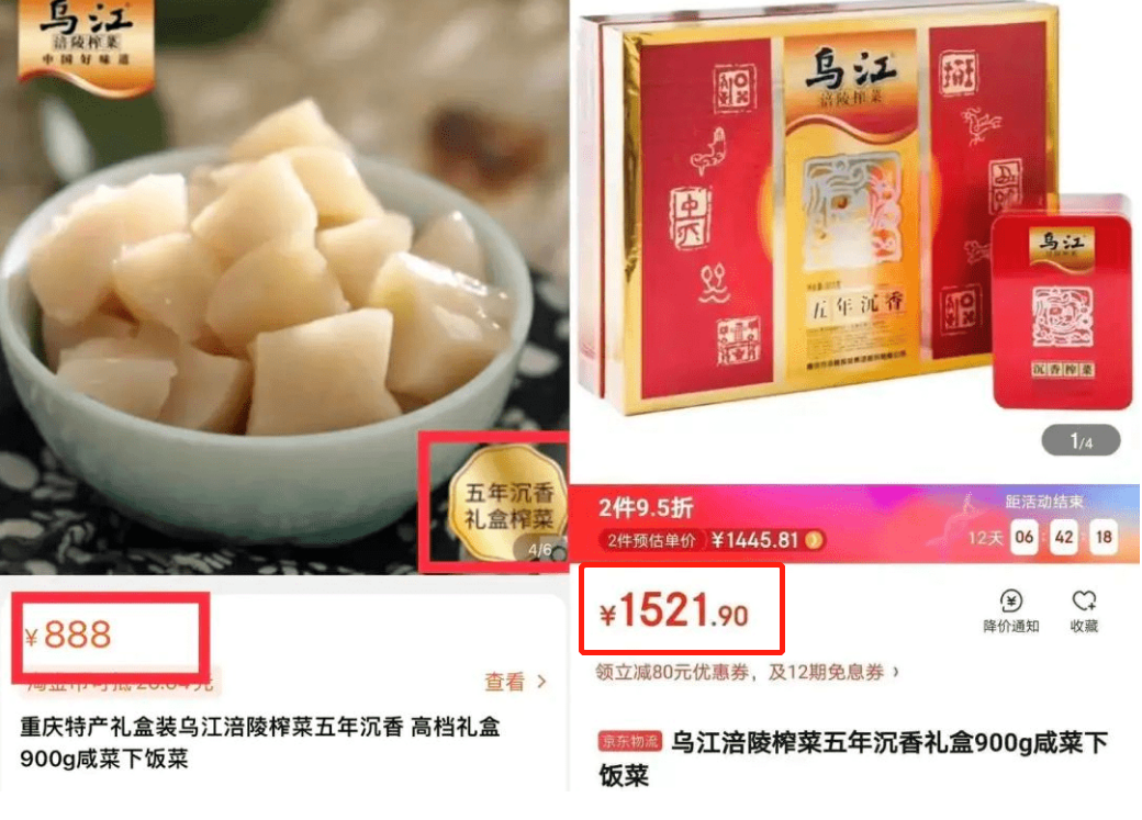 甚至曾经还推出了一款官方售价高达888元的榨菜礼盒和“五年沉香礼盒装”榨菜,售价却高达1521元。