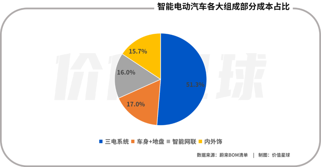 在技术方面,三电+三智系统是智能电动汽车的核心。其中三电系统成本占比最大,约占整车材料成本的51.3%。车载信息娱乐系统和驾驶信息系统升级后,包括HUD、流媒体后视镜等增量硬件都需要进行全新的适配和调试。