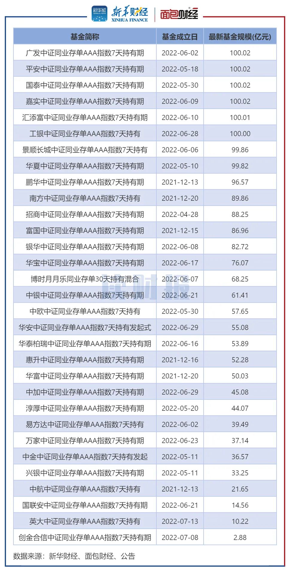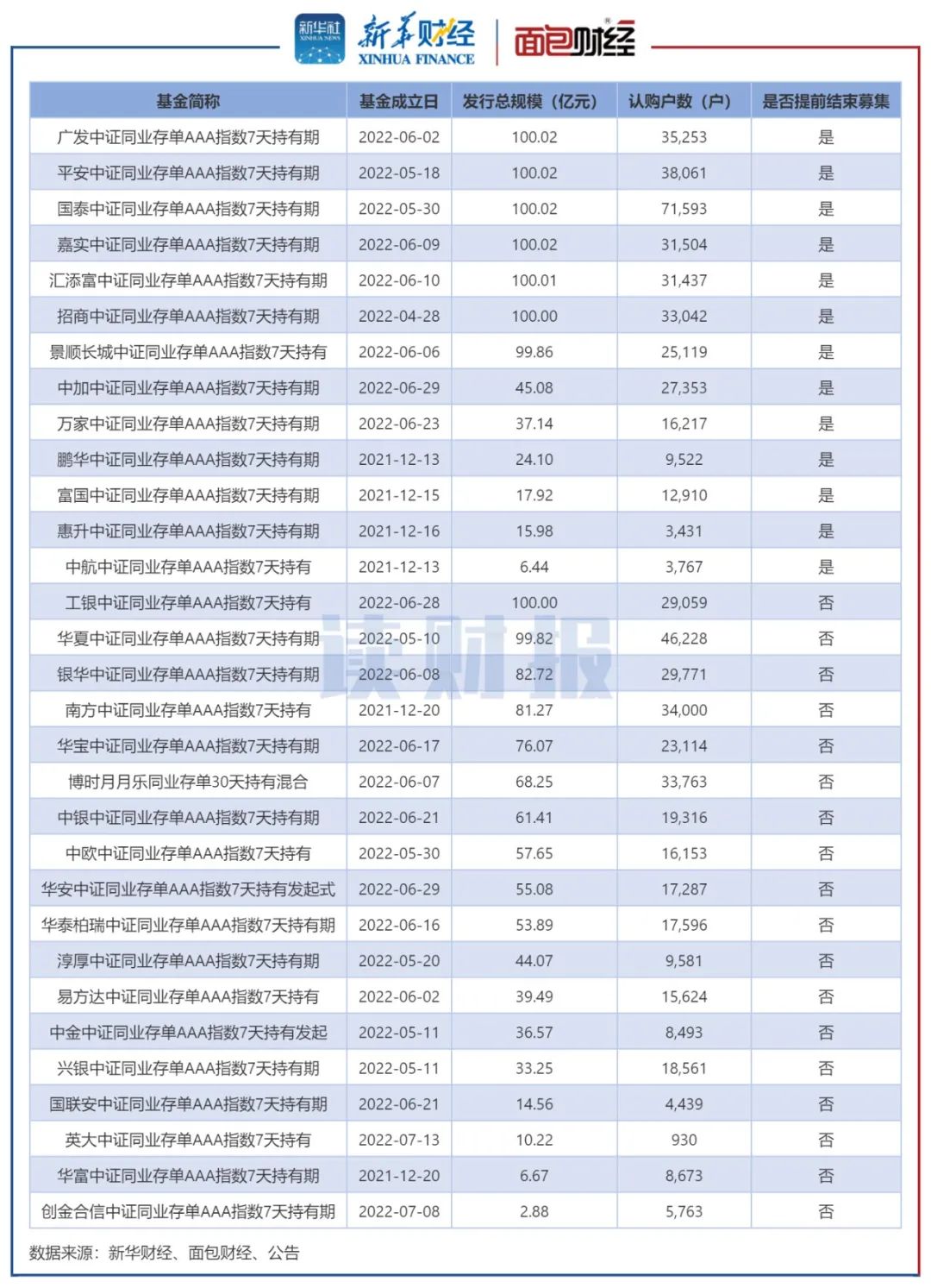 以国泰中证同业存单AAA指数7天持有期为例,该基金自2022年5月23日开始募集。截至5月26日,该基金累计认购申请金额超过100亿元,将认购比例定为70.86%,并提前结束募集。该基金的募集有效认购总户数超过7万户,在同业存单基金中认购户数最多。