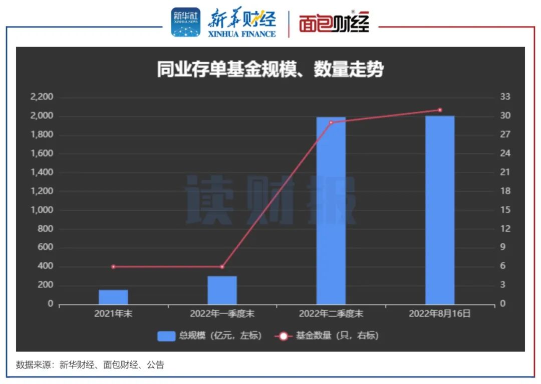 第一批同业存单基金于2021年12月成立,共有6只,之后到2022年4月再陆续成立新基。截至2022年8月24日,已有31只同业存单基金成立,总规模已突破2000亿元。