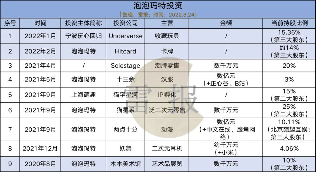 而今年以来,泡泡玛特仅投资了收藏玩具品牌Underverse及卡牌潮流文化品牌Hitcard。都和其主营业务沾边。