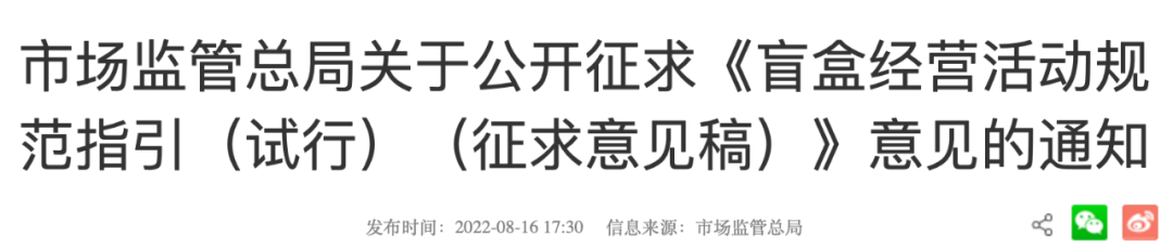 同时,盲盒占营收大头的泡泡玛特,还受到有关部门的高度关注和监管、整顿,近日,针对当前国内市场的盲盒发展现状,国家市场监管总局就发布了《盲盒经营活动规范指引(试行)(征求意见稿)》,文件指出,盲盒经营者不得向8周岁以下未成年人销售盲盒。向8周岁及以上未成年人销售盲盒商品,需取得相关监护人的同意。