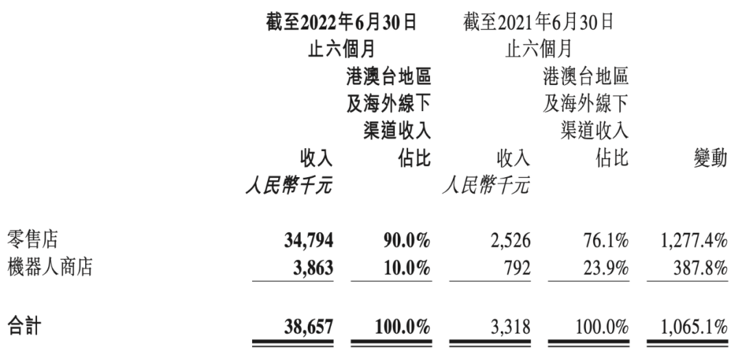 港澳台地区及海外,“线下收入”由2021上半年的331万元上升到2022年上半年的3865万元,同比增长1065.1%;其中零售店占比90%,机器人商店占比10%,对应收入分别为3479万元和386万元。