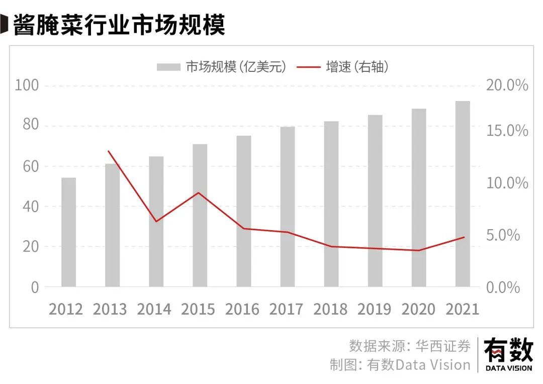 涪陵榨菜就属于那种在电梯里持续搭梯子的选手——行业在涨,它自己也在涨。但从酱腌菜市场的规模来看,它的增速其实已经有所放缓。