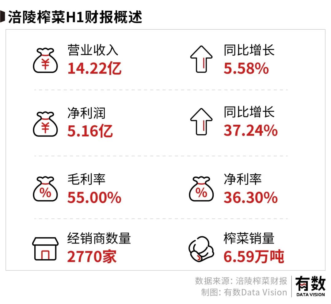 7月30日,涪陵榨菜发布2022H1财报,报告期内营收14.22亿,同比上涨5.58%,净利润5.16亿,同比增长37.24%,净利率36.3%。