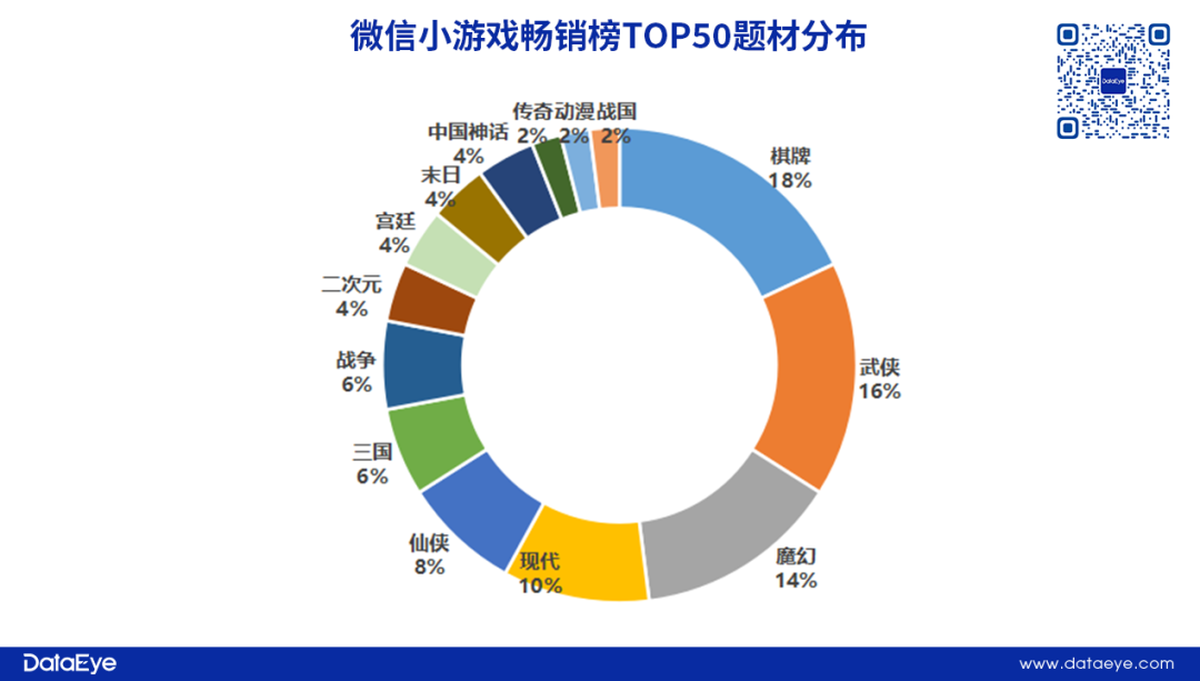 从题材上看,棋牌、武侠、魔幻占比高。以DataEye-ADX小游戏题材分类显示,棋牌品类优势明显,占比约18%。这主要得益于微信生态中较强的社交属性和国内规模较大的用户人群。