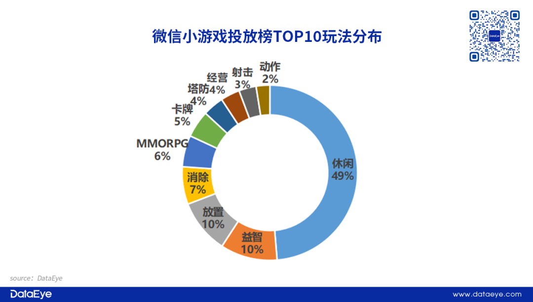 小游戏玩法投放分布上,根据DataEye-ADX投放数据显示,休闲游戏投放占比接近50%,与其他游戏玩法呈现出较大的差距。其次,益智类、放置类以及消除类仍排名前列,说明在投放市场上相对轻度的品类投放数更多,产品基数更大。