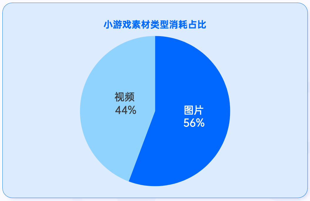 根据微信小游戏白皮书显示,在小游戏类型上,图片素材消耗占比约为56%,略高于视频素材。其中,微信公众号近65%、朋友圈近80%消耗来自图片,而小程序中视频素材消耗超过85%。总体来看,图片素材更贴合信息流场景,而视频素材多以激励视频场景为主。