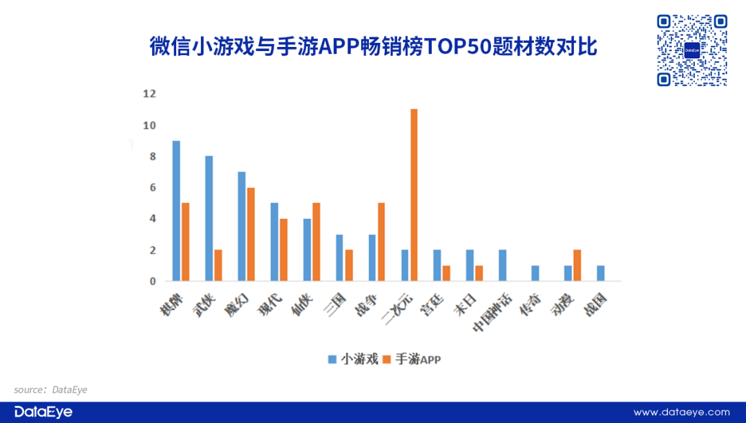 小游戏畅销榜上,二次元、动漫、战争题材低于APP畅销榜。参考同一时间七麦数据iOS畅销榜来看,小游戏端的棋牌题材、武侠等题材占比更高,主要是因为微信小游戏社交属性强,棋牌题材优势明显,而武侠国风内容俏皮可爱更适合小游戏厂商创作。另外,二次元题材则占比明显较少,或许因为该题材对游戏画风要求更高,并且目标用户基数不大。
