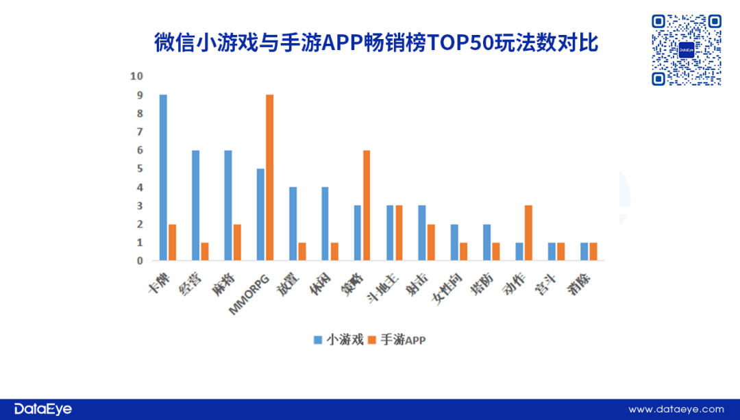 对比目前iOS手游畅销榜来看,小游戏端卡牌类型占比更高,主要是因为卡牌玩法主打数值比拼,比较契合小游戏平台。