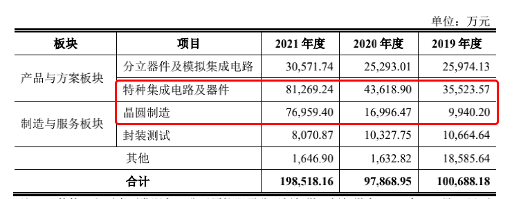 2019年至2021年,燕东微营业收入分别为10.41亿、10.30亿、20.35亿。2021年,特种集成电路及器件和晶圆制造是主要的两大收入支柱。
