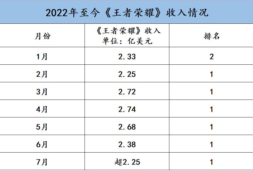 据Sensor Tower公布的数据,截至7月末,《王者荣耀》每月收入均超过了2亿美元,累计收入已超17亿美元。其中4月的收入最高,为2.74亿美元。另外,除1月外,《王者荣耀》一直占据着今年以来的全球热门移动游戏收入的榜首。