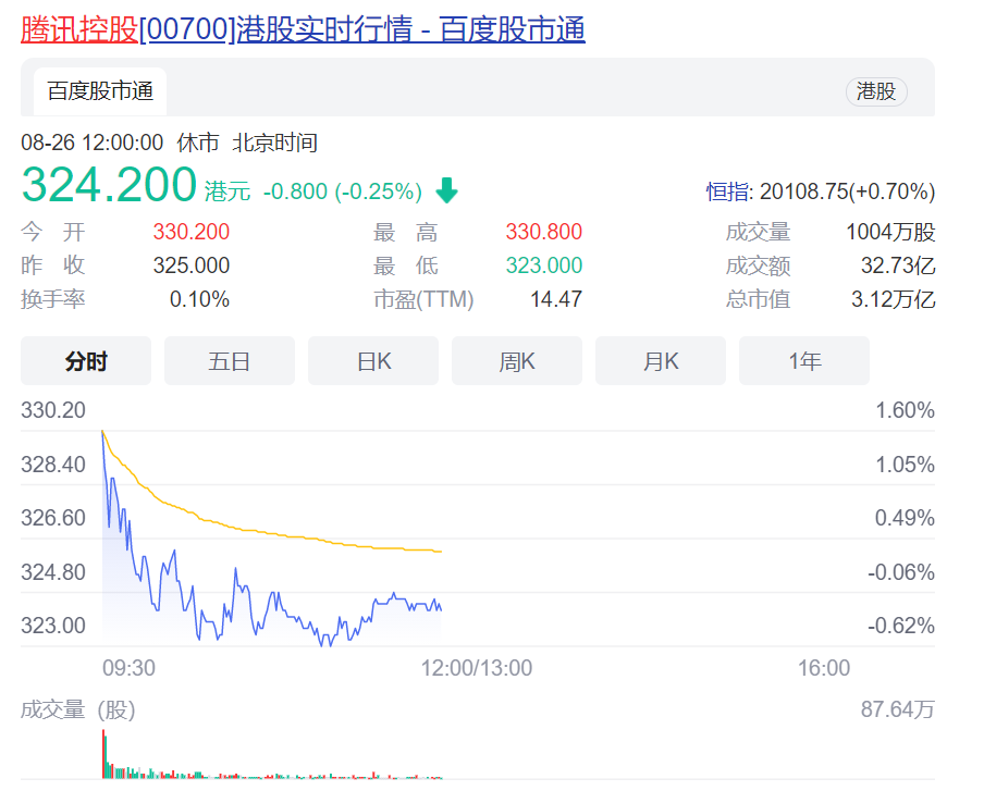 8月5日,腾讯控股甚至创下了近三年来的股价新低,每股288港元。截至8月26日午盘休市,腾讯控股每股324.200港元,总市值3.12万亿港元。