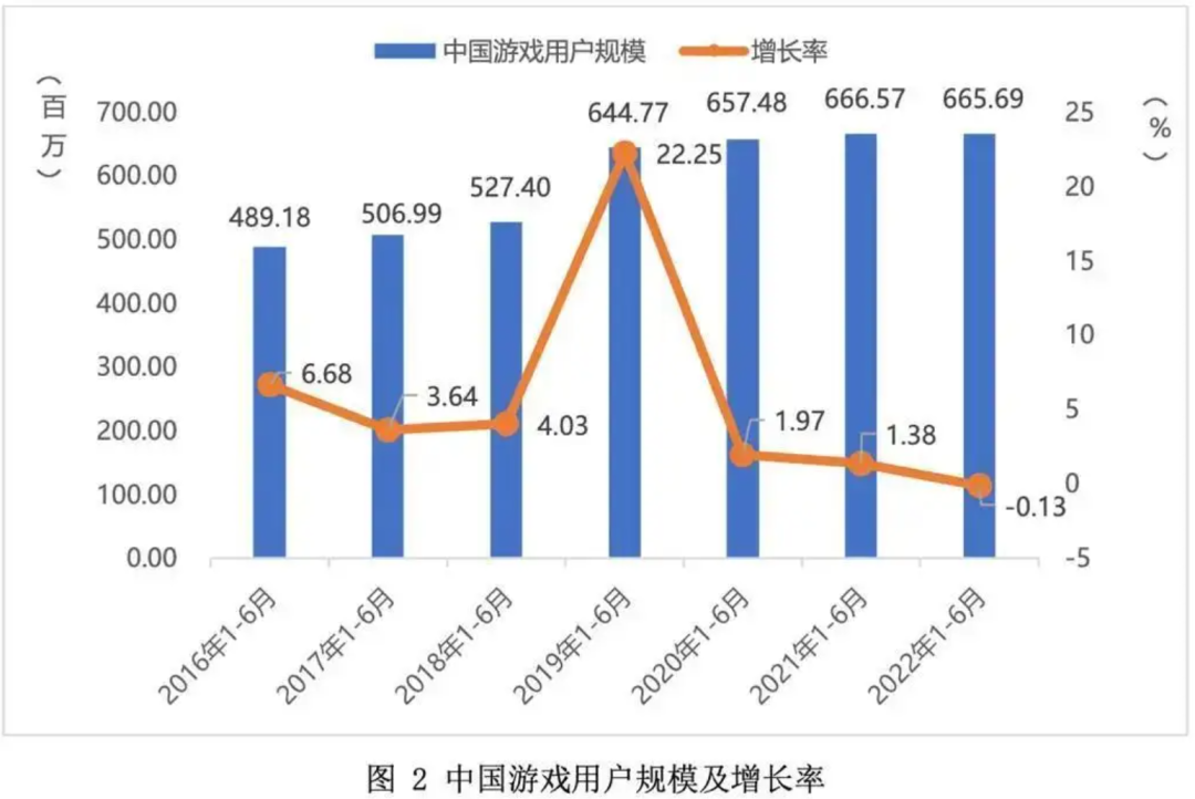 首先,用户数量会继续下降。《2022年1-6月中国游戏产业报告》显示,自2021年春节中国游戏用户规模攀升至6.67亿高峰后便显现下探趋势,2022上半年中国游戏用户约6.66亿,同比下降0.13%——这是七年来国内游戏用户规模首次同比下降,某种程度上显现出用户增长拐点将至的趋势。