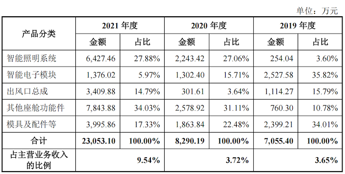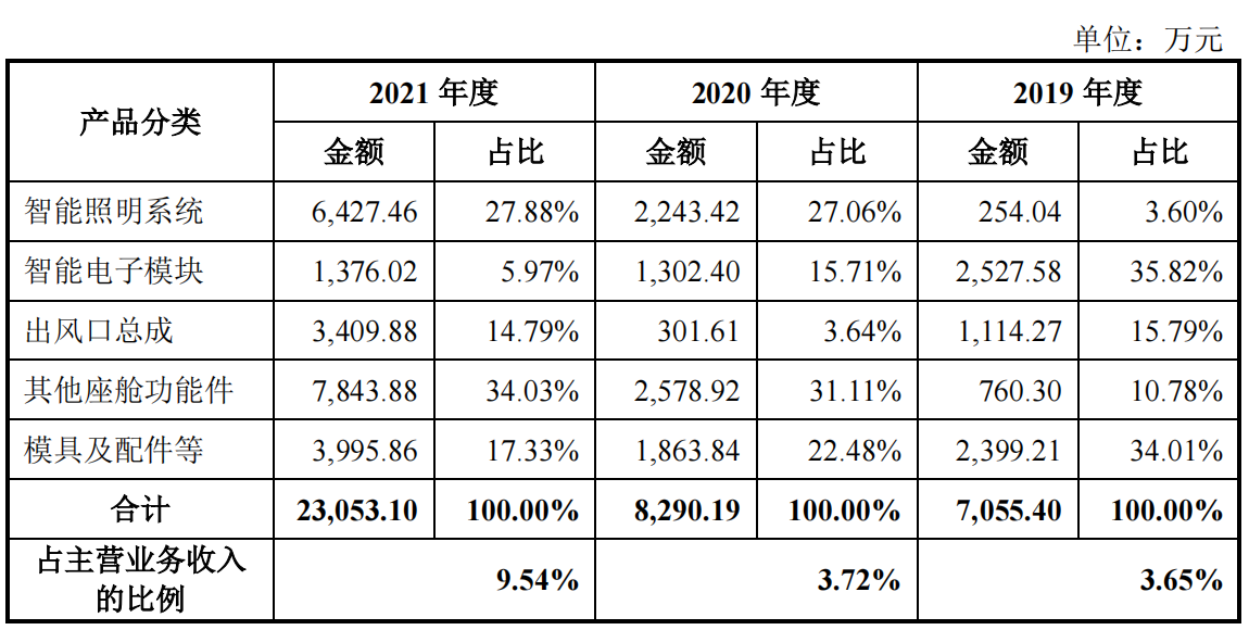 公司2021年收入占比近30%的智能照明系统三年复合增长率15.81%,其中2021年同比增长13.42%也不算高;其他座舱功能件三年复合增长率为22.65%,2021年同比增长34.34%,但该产品收入规模不足3亿元。