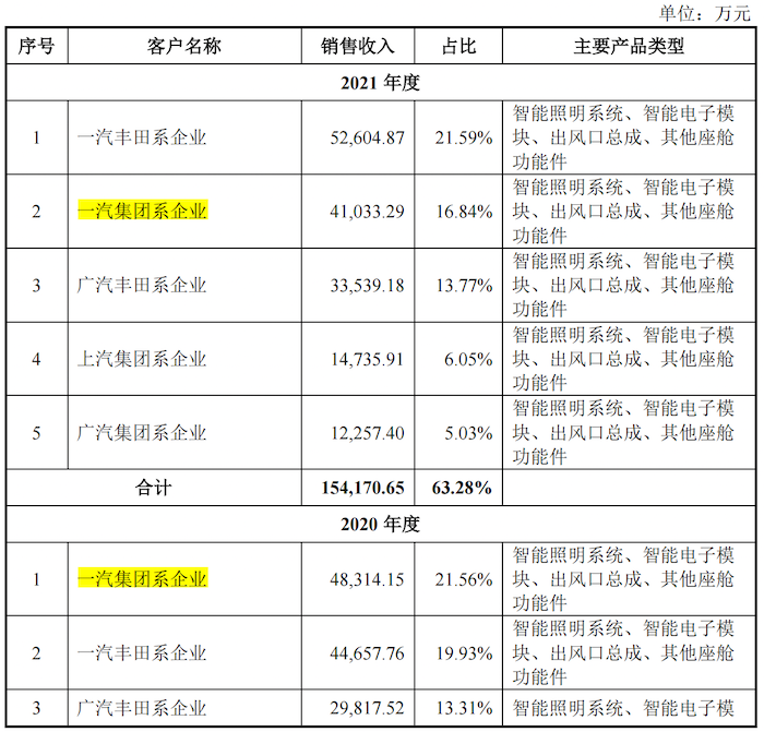 另需要指出的是,公司客户主要为一汽丰田系企业、一汽集团系企业、广汽丰田系企业、上汽集团系企业等,2019年至2021年各期向前五名客户的销售占比分别为63.74%、65.00%和63.28%,在同行业可比公司中,福尔达的前五大客户相对集中,销售对象较为局限。