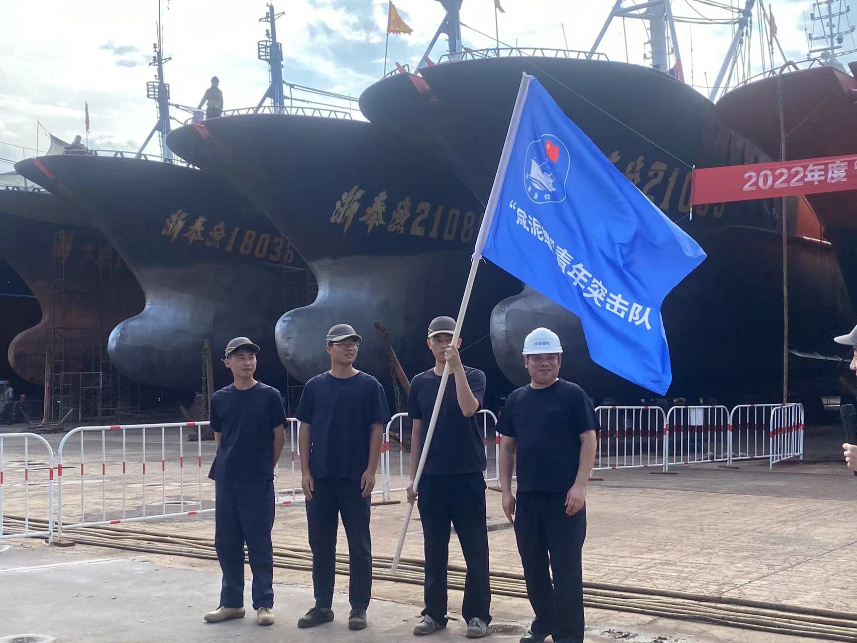 2022年8月26日,由宁波市渔船检验中心举办的2022年度“心系开渔·保驾护航”大型渔船营运检验技术竞赛在奉化区海港船舶修造厂拉开帷幕,来自宁波渔船检验系统16位验船师2人一组同台竞技。比赛当天,宁波市渔船检验中心主任宋小军向“咸泥螺”青年突击队代表授旗,标志着“咸泥螺”青年突击队正式成立。
