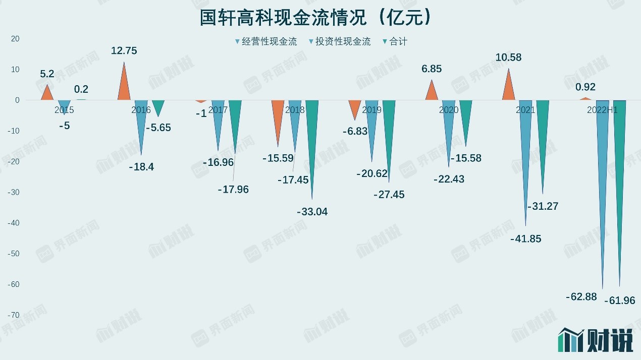 值得一提的是,自国轩高科上市以来,除了第一年出现经营性和投资性现金合计净流入之外,其余六个财政年度全部净流出。七年半来公司合计净流出192.71亿元。
