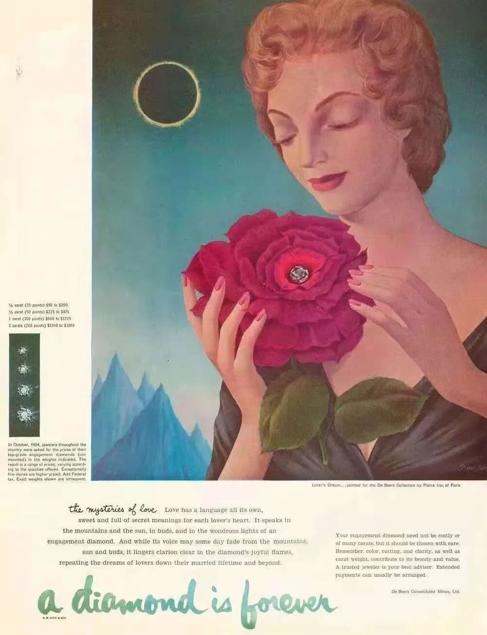 之后,精明的戴比尔斯又大下血本,将钻石包装成了“爱的礼物”,并策划出了著名的广告语:“钻石恒久远,一颗永流传。”成功让钻石与爱情绑定起来。