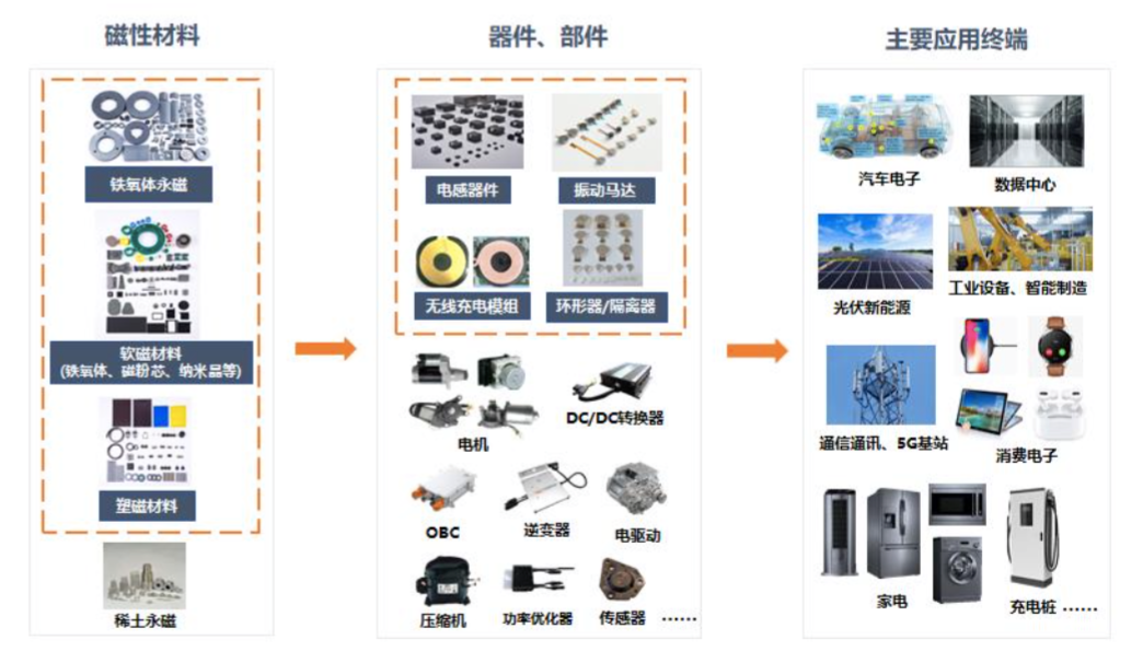 稀土钕铁硼永磁材料作为第三代永磁材料,因磁性能最优、应用最广,被誉为“现代工业维生素”,从上文图片可以看到,其应用场景与铁氧体永磁等相近。