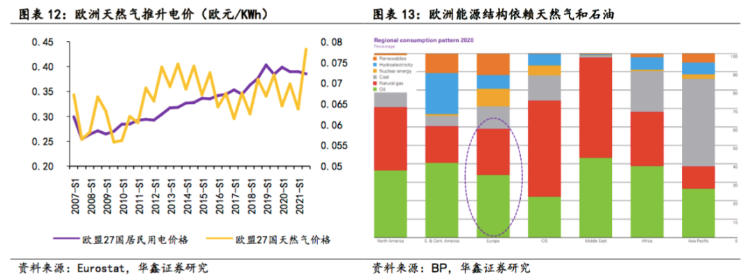 欧洲国家能源结构以天然气和石油为主,但由于本身缺乏油气资源,长期依赖进口,因此,欧洲是世界范围内较早推动新能源发展的地区,且受自然条件限制,以光伏为主。