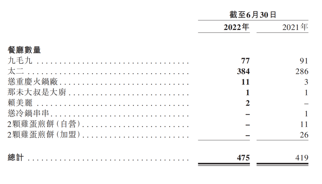 2022年6月,九毛九集团出售“2颗鸡蛋”品牌后,7间“2颗鸡蛋煎饼”自营餐厅及15间“2颗鸡蛋煎饼”加盟餐厅已从公司的餐厅网络剔除。
