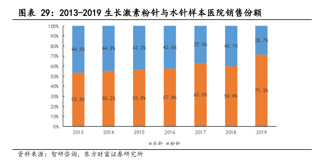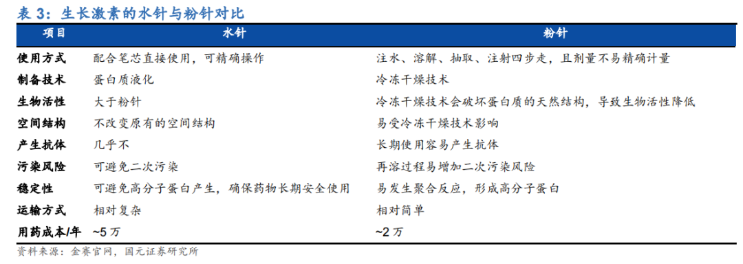 按照制剂类型划分,市场中的生长激素存在3种不同的规格:粉针、水针、长效水针。