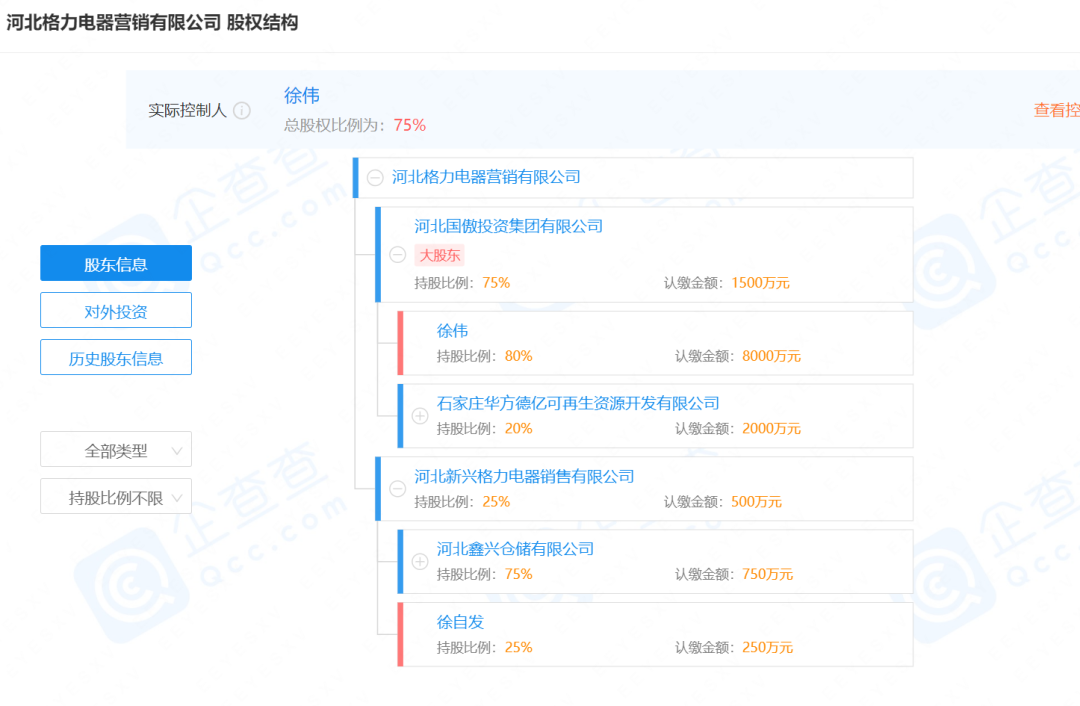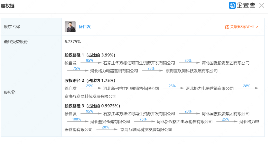 截至今年6月,京海互联仍是格力电器第三大股东。而在这10家经销商中,河北格力电器营销有限公司持股最多,比例为28%。穿透股权链显示,这家公司最终实控人为徐伟。据第一财经报道,徐伟正是徐自发的儿子。此外,徐自发本人间接持有京海互联6.7375%的股份。