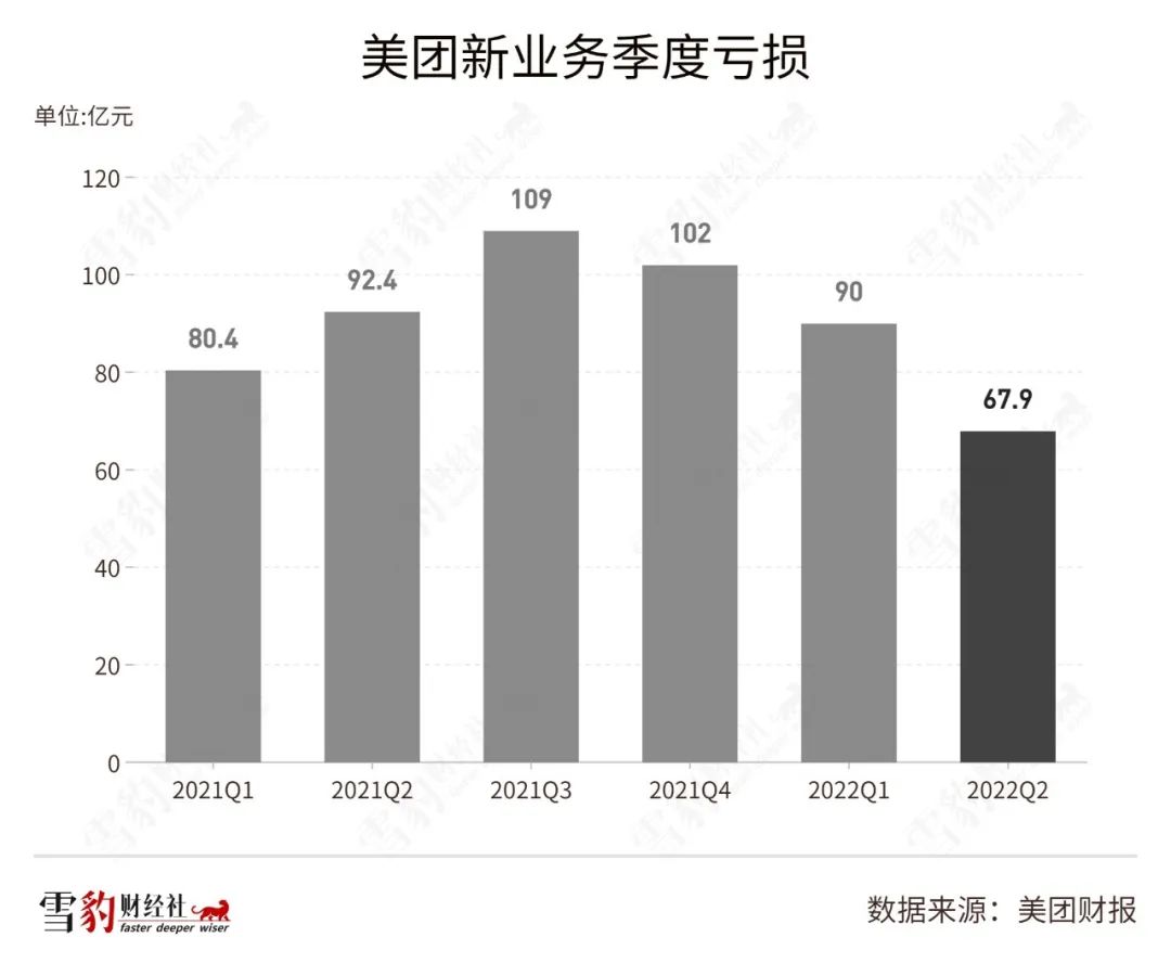 以新的业务划分口径,2022年Q2,美团新业务板块收入同比增长40.7%至142亿元,经营净亏损收窄至67.9亿元。