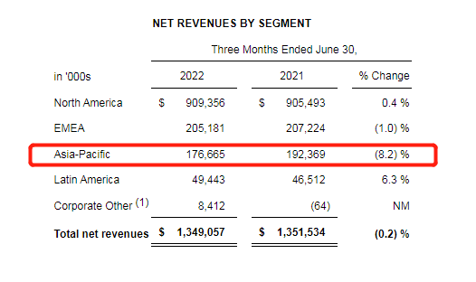 按地区分,国际市场收入同比微降3%,北美收入无增长,录得9.09亿美元,国际收入受中国等市场停滞拖累下降3%至4.31亿美元。