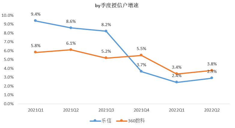 具体来看,360数科该指标从2021Q1的5.8%下滑至2022Q2的3.8%,乐信该指标从同期的9.4%下滑至2.9%。特别是2021年四季度,乐信直接从8.2%下滑至3.7%,而360数科同期不降反升从5.2%升至5.5%。一降一升之下,乐信与360数科的累计授信用户规模差距也被重新拉开。