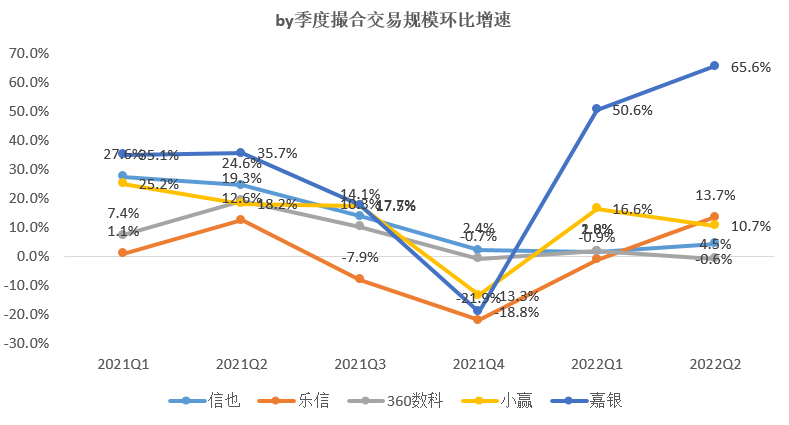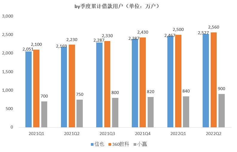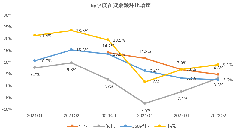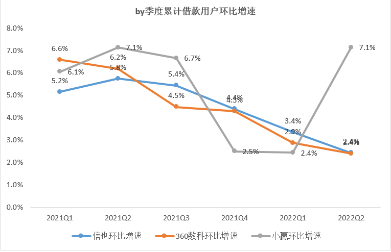 从累计借款用户环比增速来看:除小赢环比增速二季度有所反弹之外,信也、360数科累计借款用户环比增速by季度均呈现缓慢下滑趋势。