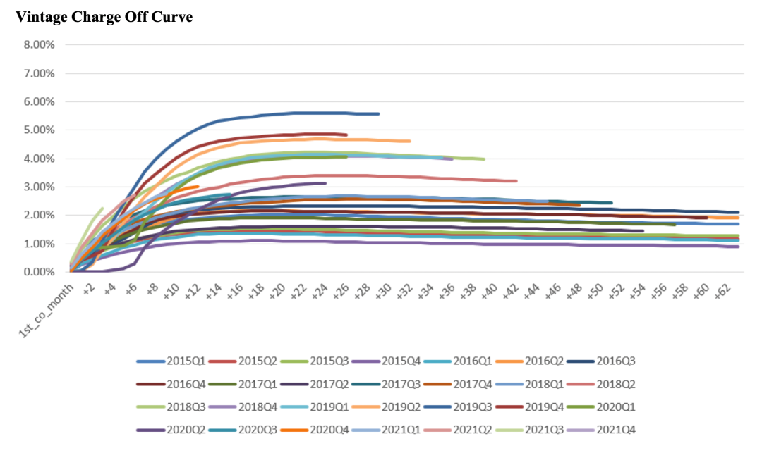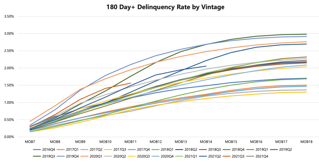 by vintage 坏账率是以静态池的角度来观察各期间资产的坏账表现,它能将总资产分割为不同交易周期的资产块,然后通过观察不同交易周期内的资产在各个阶段的逾期表现,进而评估资产质量。